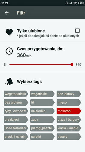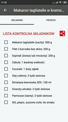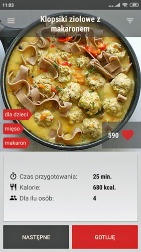Aplikacja losuje i wyświetla przepisy w oparciu o wybrane przez Ciebie parametry. Jedną z opcji jest stworzenie bazy ulubionych przepisów (oznaczenie przepisu ❤), z której później nasza “maszyna losująca” wybierze propozycje obiadów na dzisiaj. Kiedy spodoba Ci się któryś z pomysłów, wystarczy sprawdzić kontrolną listę produktów (można ją udostępnić osobie odpowiedzialnej za zakupy!) i przejść do gotowania. Problem “Co dziś zrobić na obiad?” mamy z głowy!