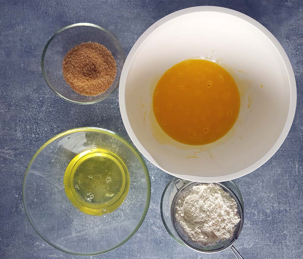 • Białka ubić na sztywną pianę, do żółtek dodać cukier i również ubić na puszystą masę.