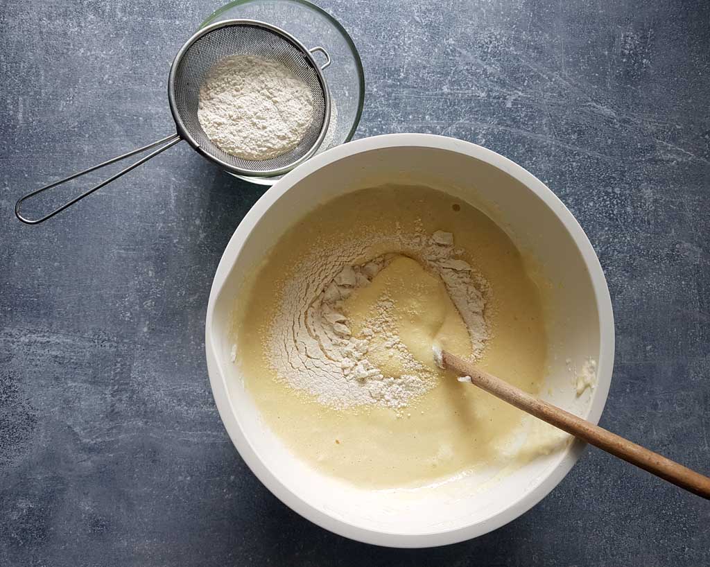 • Do masy jajecznej dodawać stopniowo łyżka po łyżce przesianą mąkę, bardzo delikatnie mieszać od dna za pomocą szpatułki, do połączenia się składników. Masa musi pozostać puszysta, ponieważ to dzięki pianie z białek biszkopt urośnie.