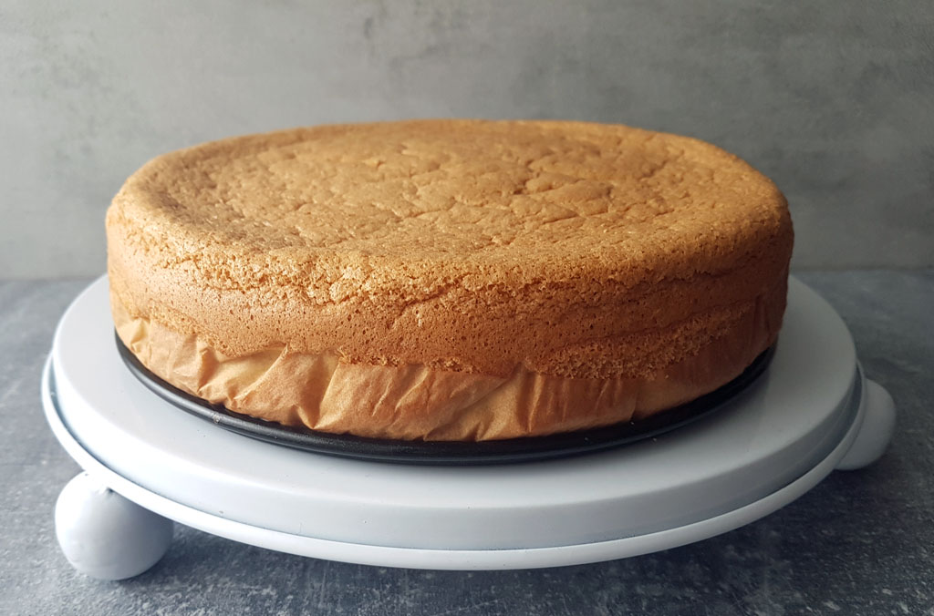 • Pozostawić biszkopt w tortownicy na 10 minut, następnie za pomocą silikonowej szpatułki delikatnie odsunąć go od brzegu foremki i wyjąć, dalej studzić na desce do krojenia lub dnie tortownicy. Nie należy kroić ciepłego biszkoptu, ponieważ uszkodzi to strukturę ciasta.