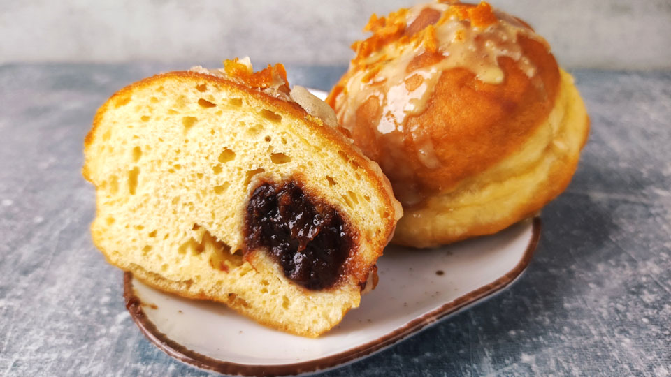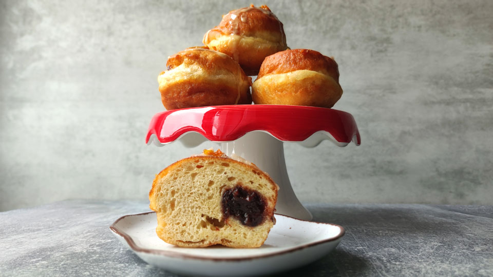Klasyczne pączki drożdżowe z konfiturą śliwkową wykonane metodą dwufazową- najpierw przygotowuje się rozczyn, a później ciasto właściwe. Sprężyste, aromatyczne i wyrośnięte. Pozostają smaczne na drugi dzień.